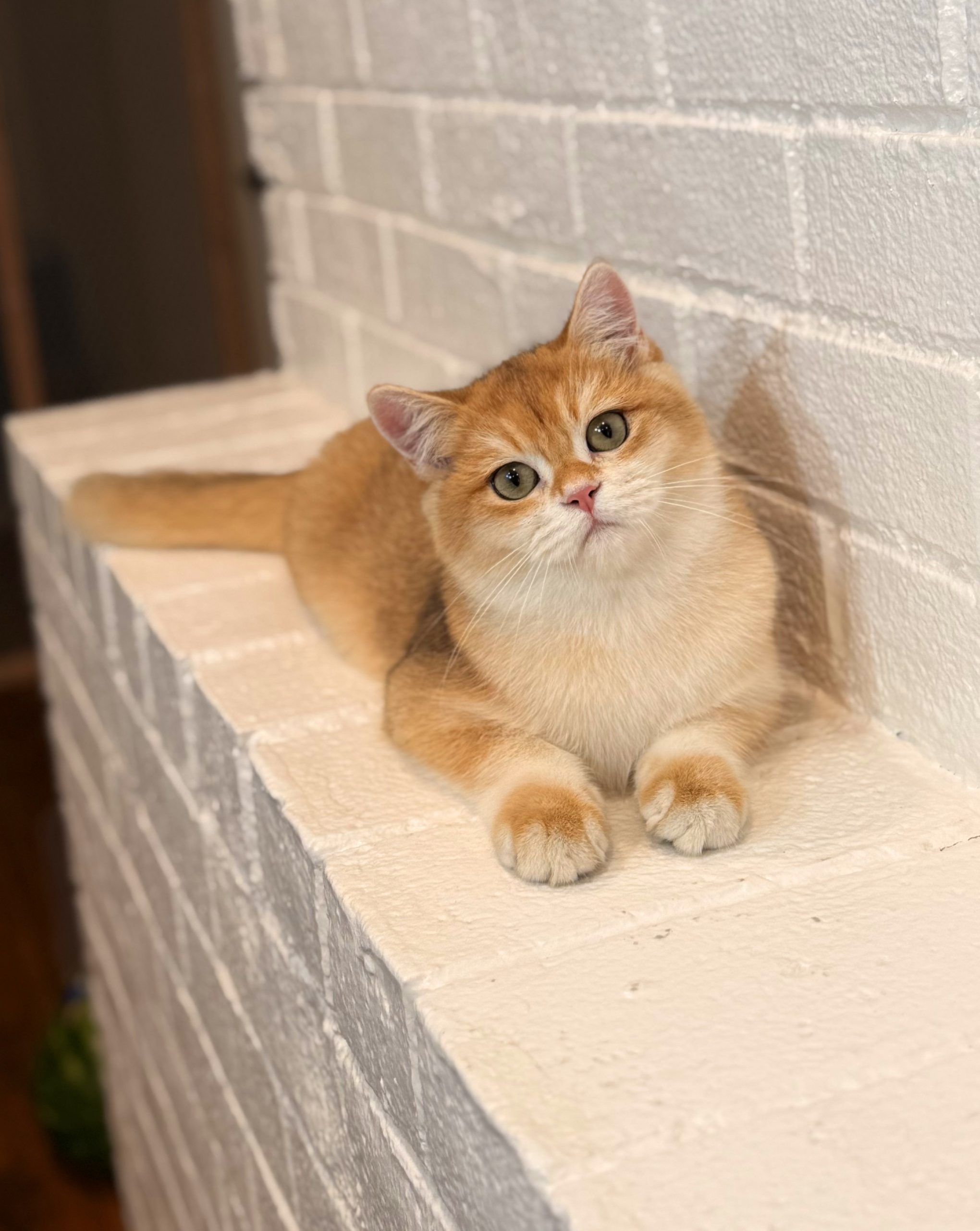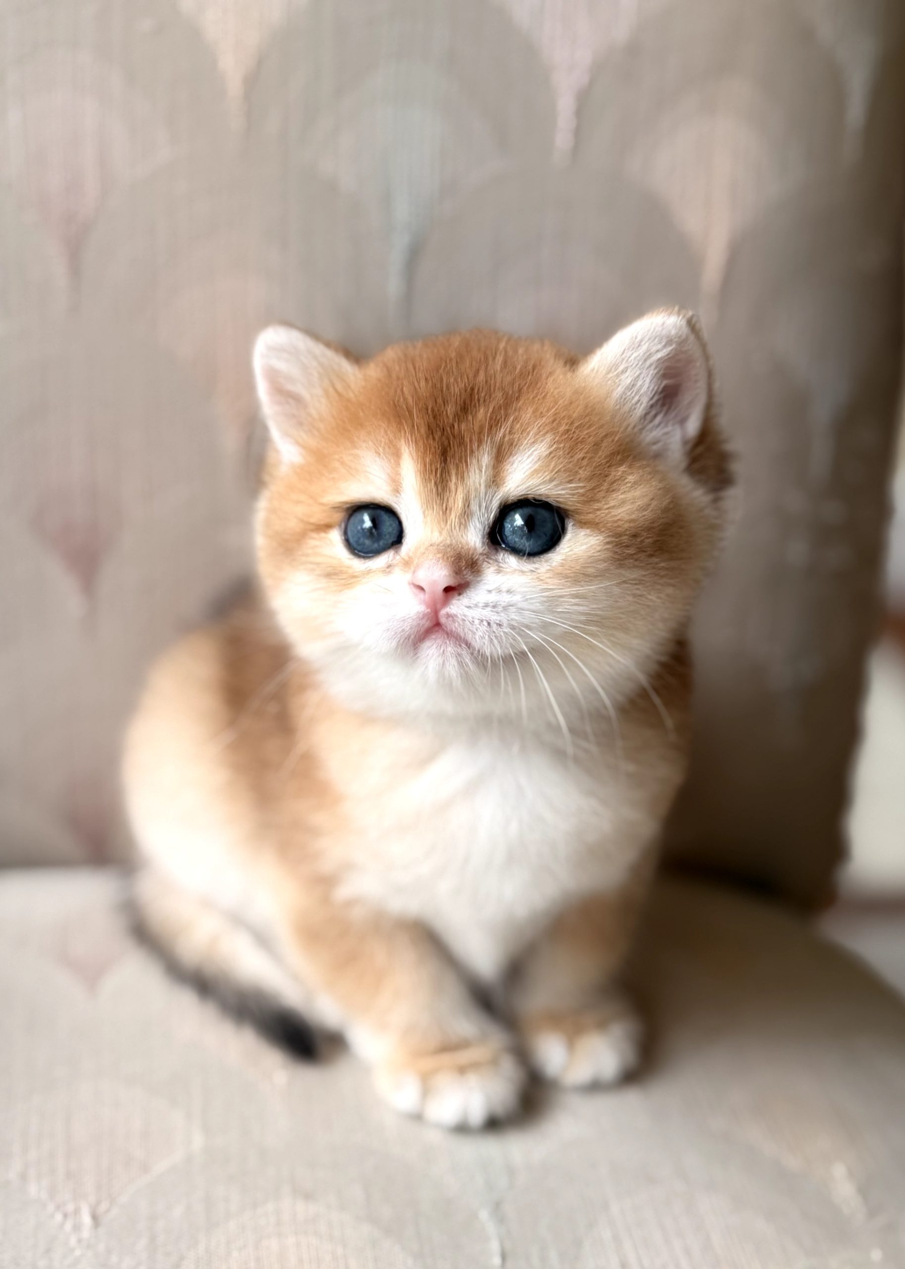 DOB 05/06/2025 Shorthair Golden British Chinchilla boy. Very affectionate and tame kitten loves to sit and sleep on your lap. Vaccinated according to age, trained to use a litter box and scratching post, ready to move to a new loving home
